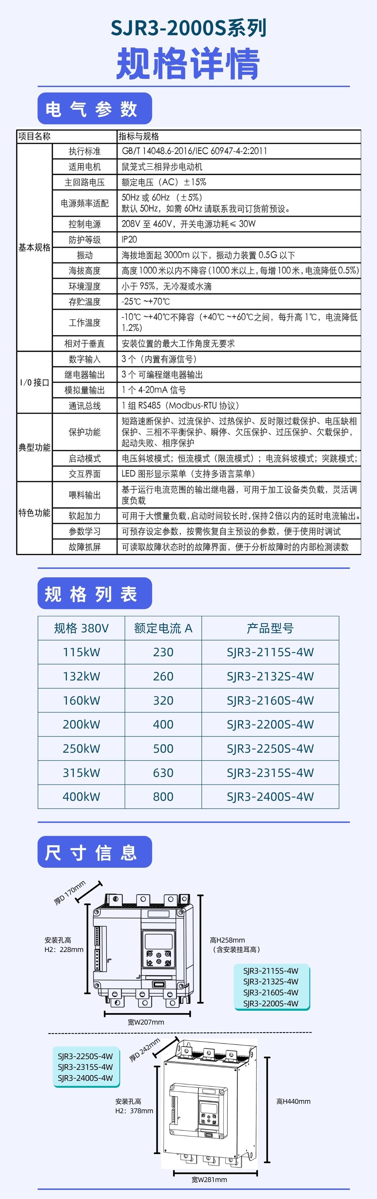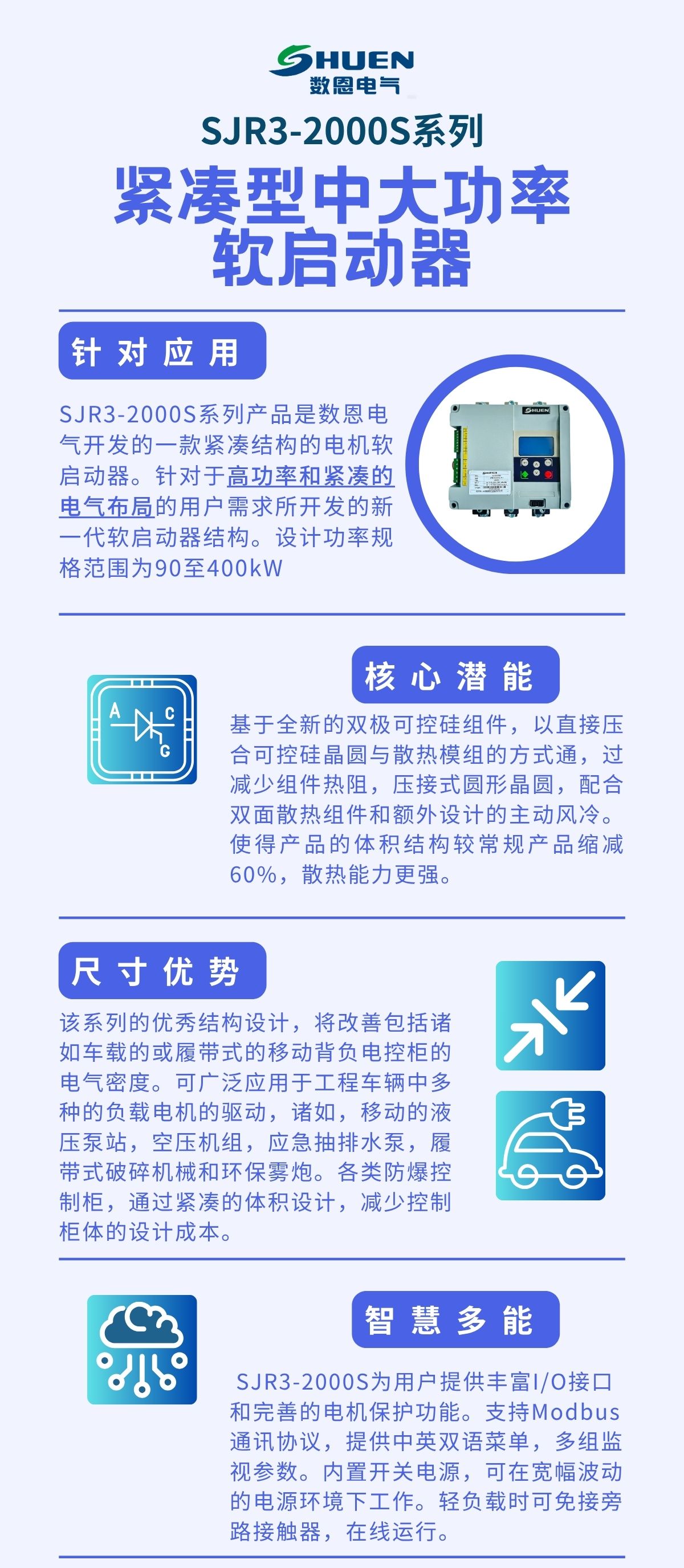 SJR3-2000S是AG恒峰公司最新研发的超紧凑软启动器,针对紧凑的车载(履带式)电柜 / 防爆电箱 / 壁挂基业箱 提出高密度电气解决方案,兼容在线式应用的同时兼备有外置旁路连接方式,增加了欠载,运行次数,运行时间,线性的温度监控等多种功能,内置集成了RS485通讯总线,提供多语种菜单。